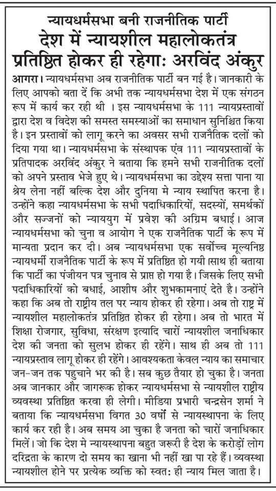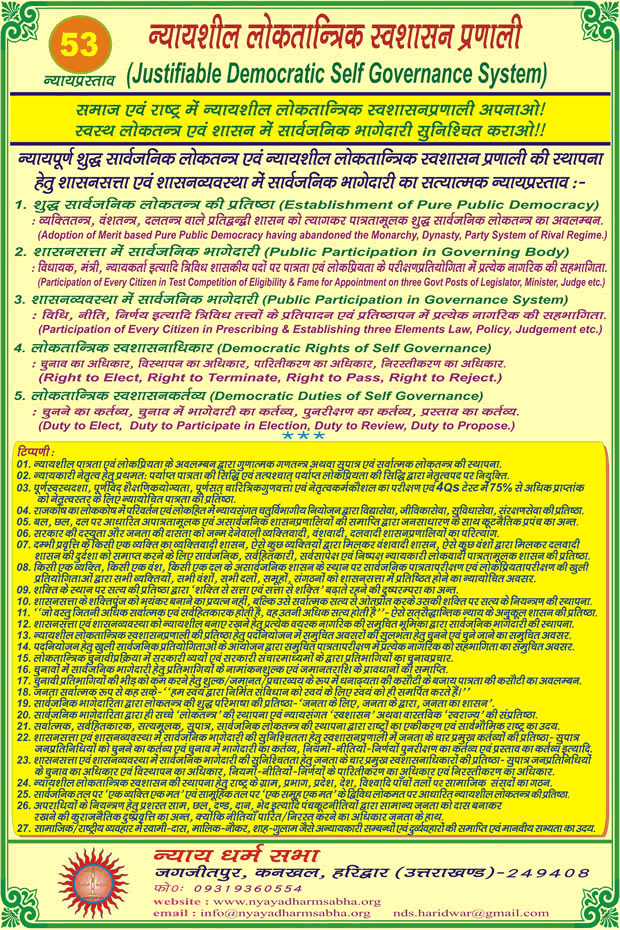 The Political Party 'Nyaya Dharm Sabha' (NDS) has proposed 111 Justice Proposals to implement the Justice in Society & Nation. The 53rd Justice proposal of NDS is Mahaloktrantra i.e. Justifiable Great Democratic Public Self Governance System. The proposal named Mahaloktantra strengthens the hands of Public of the Nation, where the Government body can not do anything without public consent. In Mahaloktantra, the Government Body and Governance System is operated by the Public Vote or by the Public Consent. That's why it is called the "Self Governance System" in which the Government is controlled by the Public itself. In Mahaloktantra, all three Sections and their operations are completely Democratic. This Mahaloktantra is the real and purest form of Democracy In Hindi, the Democracy is known as "Loktantra". The word "Loktantra" is a combination of two words- 'Lok+Tantra'. The meaning of "Lok" is Public, and the meaning of "Tantra" is Governance. The Public Governance is known as Loktantra i.e. Democracy.