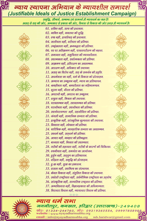 Nyaya Dharm Sabha is based on the True & Real Vision. The Visionary Principle prescribed by Wisdom & Science, so far that has been fully & finally accepted by NDS. The world is consist of two things. One is the Soul and second is the Nature. These two things are called the 'Brahm' and 'Maya' in Sanskrit language. The Soul is indivisible and the nature is divisible. The Soul is one and the Nature is several. The Soul is God and Nature is Desire. The God and its Desire is combinedly creating the world. So both of them, are the basic things to decide any Rule & Regulation, Law & Policy of the Worldly System. Our Society or Nation requires these two things combinedly to manage its System properly. The Vision of Soul prescribes the basis of Equality and the Vision of Nature prescribes the basis of appropriateness. This Equality & Appropriateness are combinedly accepted to create the Justice in Society and Nation.