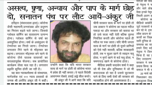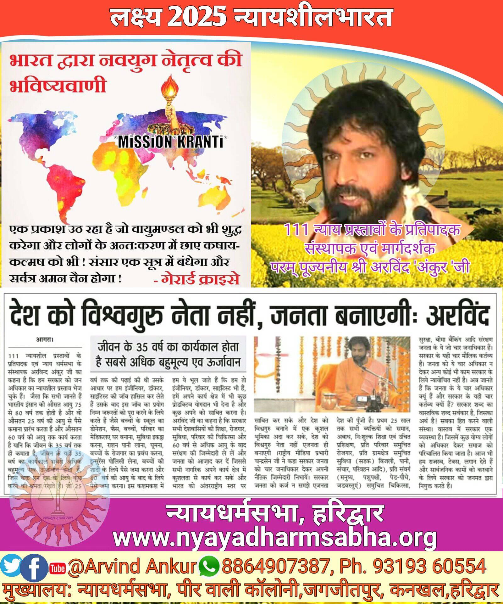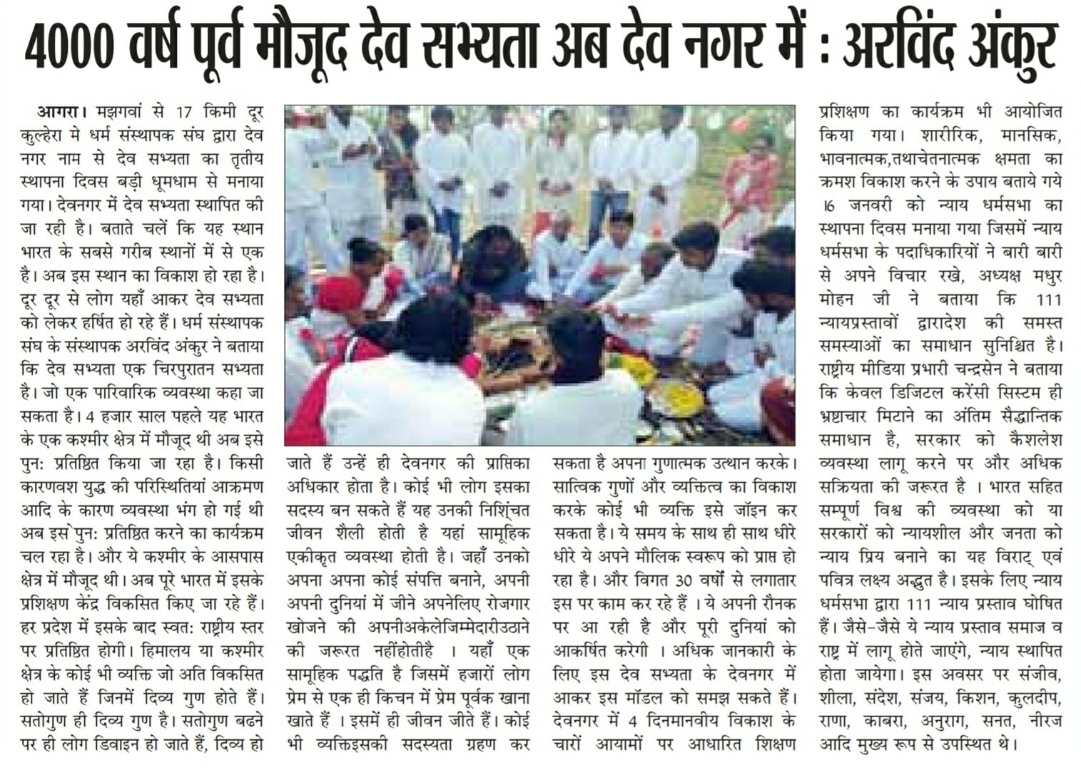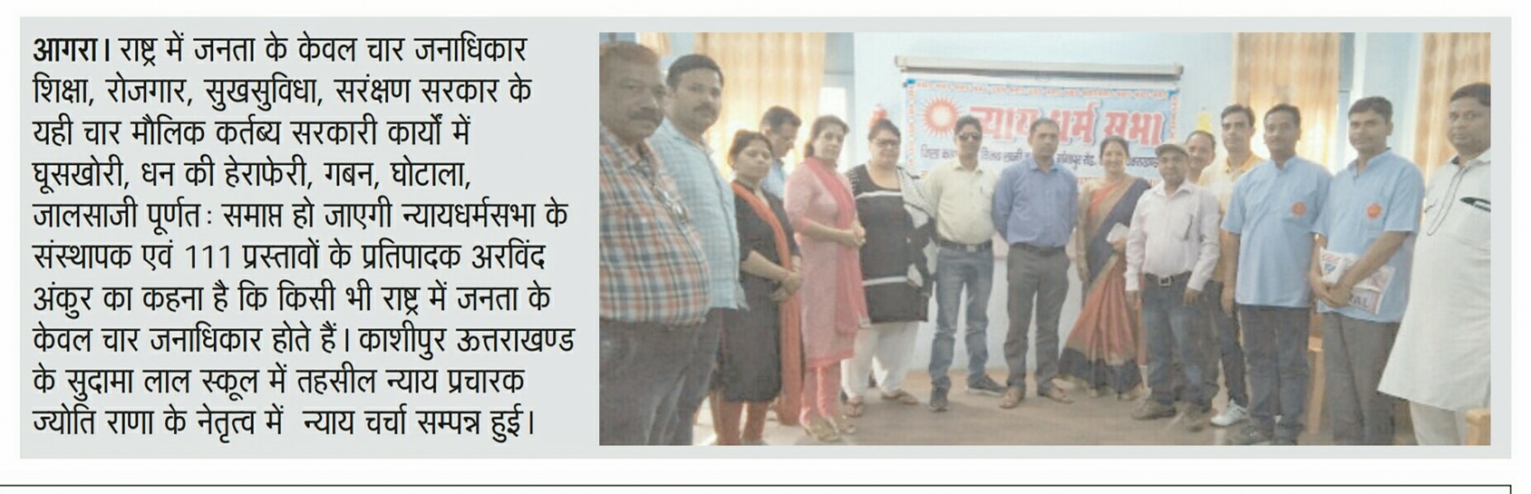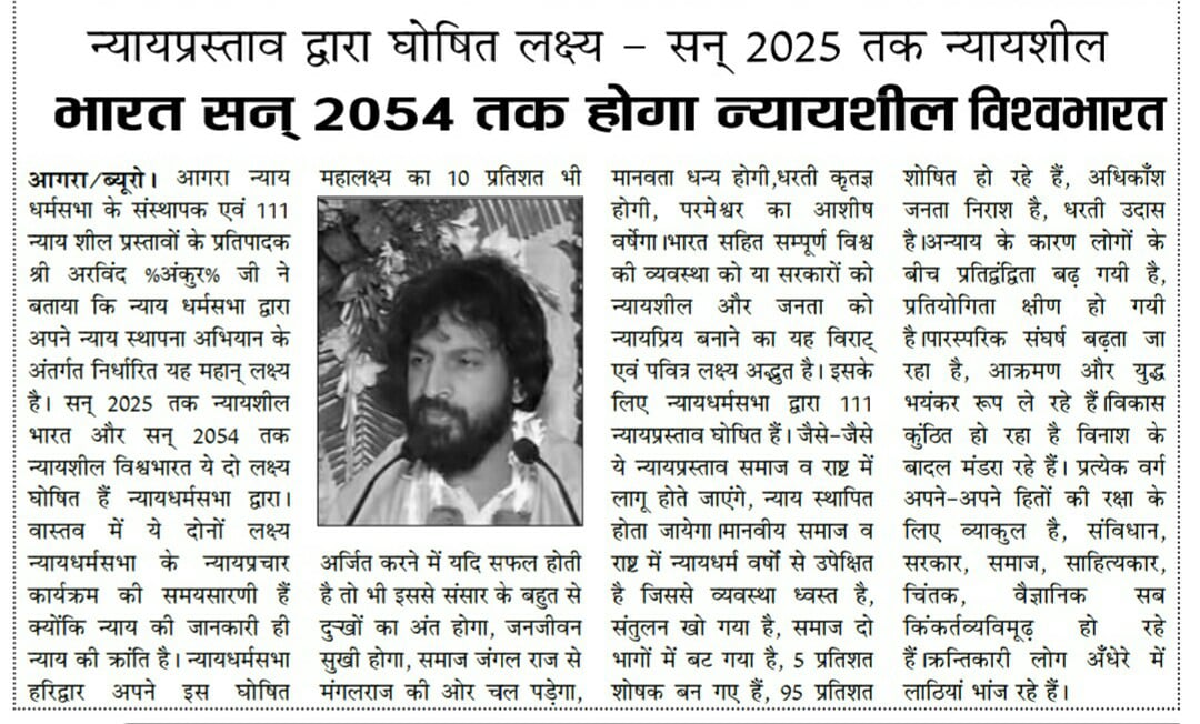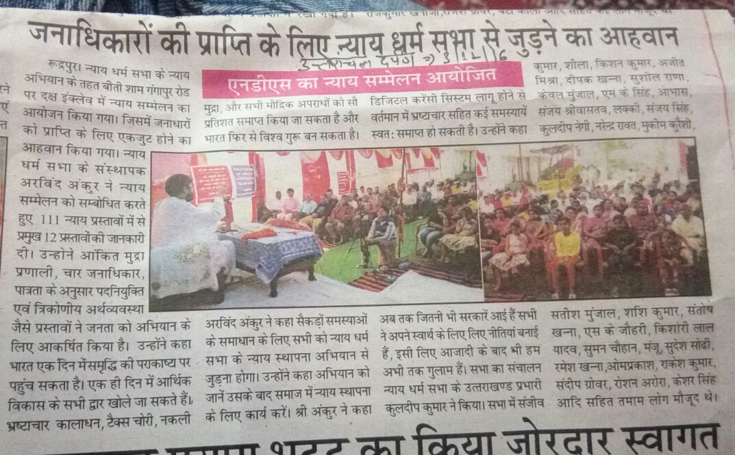 Today, the Third Nyaya Sammelan was organized by Nyaya Dharm Sabha, Haridwar. People from Chattisgarh, Madhya Pradesh, Maharastra, Uttar Pradesh, Uttarakhand & Delhi attended the Program. Local Media Persons from Print & Electronic has covered the Total Program. On this Occasion, four Action Plan has been declared to be launched. These four plans are Vidya Yojana, Udyam Yojana, Gram Yojana, Swasti Yojana. From these four plans, first two plans have been launched immediately. A free of charge School has been started under the Vidya Yojana for the Public. Anybody can take the admission in this School without paying any admission fees, monthly fees, exam fees etc. Under Vidya Yojana, an special Education & Training Policy has been launched by Shri Guru Ji through releasing a booklet on it. The Second Plan Udyam Yojana has also been launched on the occasion for the purpose to create the Employment and special Triangler Economy has been declared by Shri Guru Ji through a book on it. To deal with the problem of unemployment a special Banking System named Satdharm Financial Sevice has been declared to be established to provide the interest free loan to public & needy people. This monetary service is aimed to remove the bad tradition of Interest on Money and to provide the capital for self employment and to fulfill other needs of Public. It has also been declared by Shri Guru Ji that Third Plan of Action will be launched on 1st Janurary 2016. And in the same line, the 4th Plan of Action will be declared on 1st January 2021. Thus, all the Four Plans of Action will be implemented upto the 2025. In his speech, Shri Guru Ji expressed that these 15 years are most important for the renovation of India. And the Whole World will be renovated upto 2054 by this Institution. We may hope well that the Whole World will get the Religion of Justice to live with each other joyfully & peacefully. Under the Just Constitution of Universal Nation. The dream of One World, One Nation, One Constitution, One Army, One Humanity, One Language, One Currency is nearning to be True & Real.