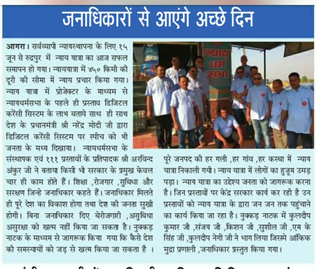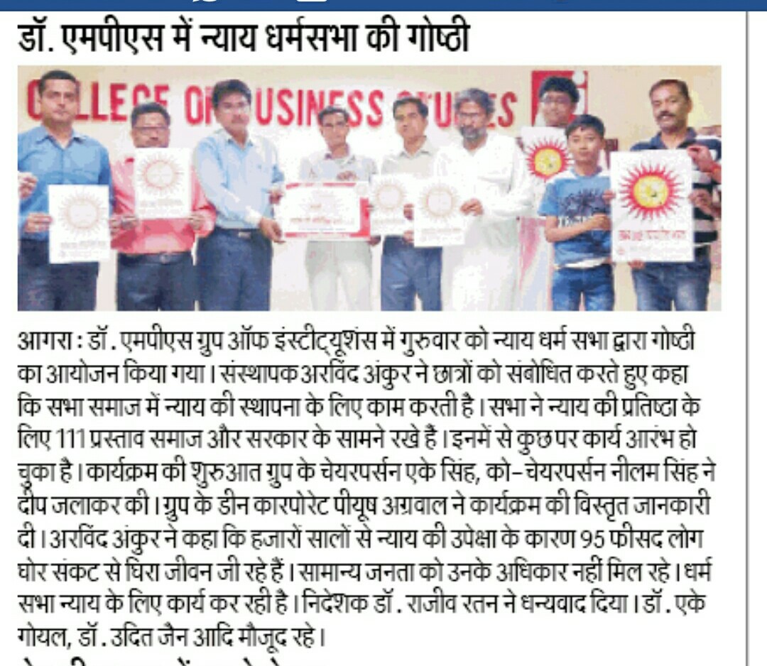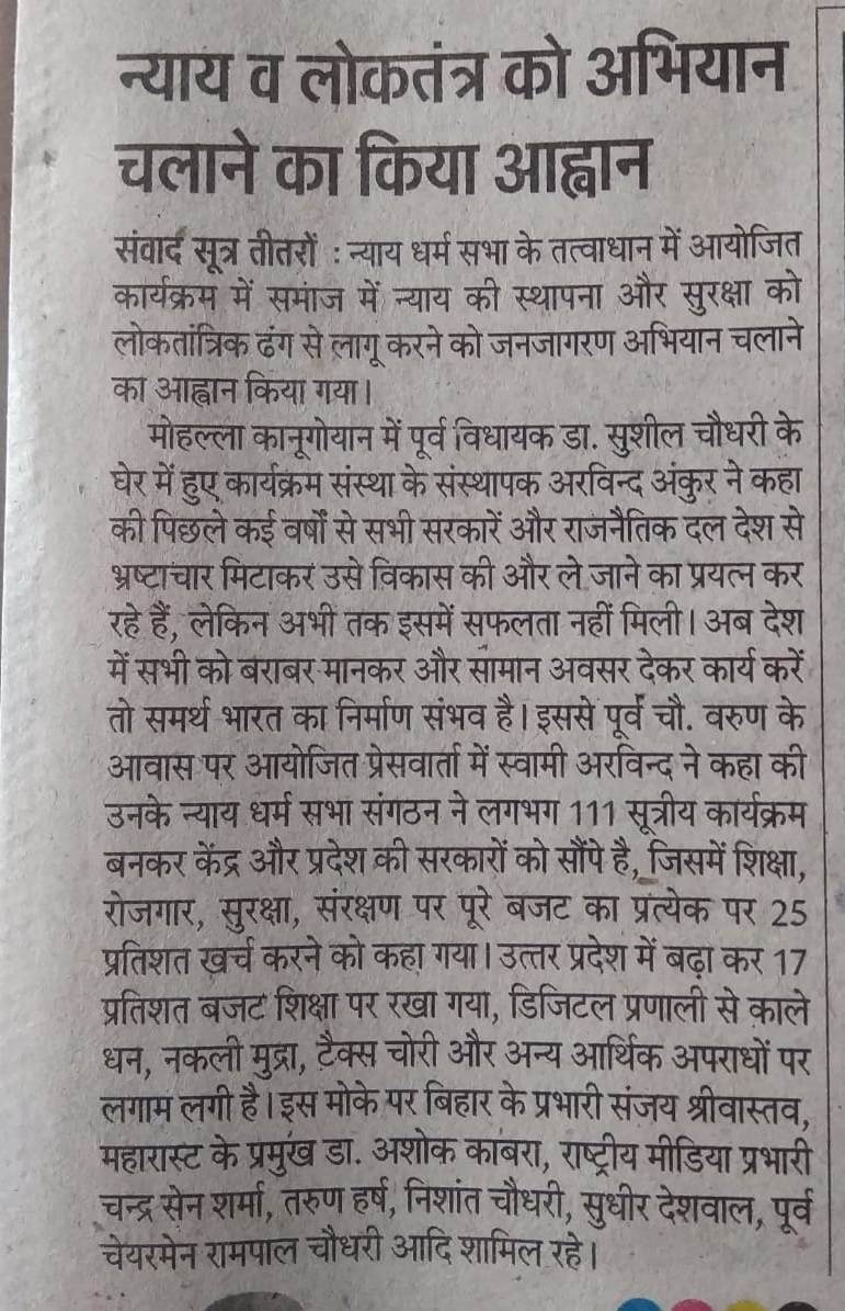 Conference Organized to announce the Formation of Social Parliament & Advent of Justice Journey Nyaya Dharm Sabha has organized a two days public meeting to announce the formation of Universal Social Parliament and to announce the beginning of Justice Journey to disseminate "Social Justice" in Society. Shri Ram Naresh Gupta, CEO of Raftar Times, Smt. Anny Kohli ji, famous Social Activist from Mumbai, Maharastra, Dr. Ashok Kabra, Social Activist, Maharastra have participated in the meeting. Also, All the members of Organization were present on the occasion.