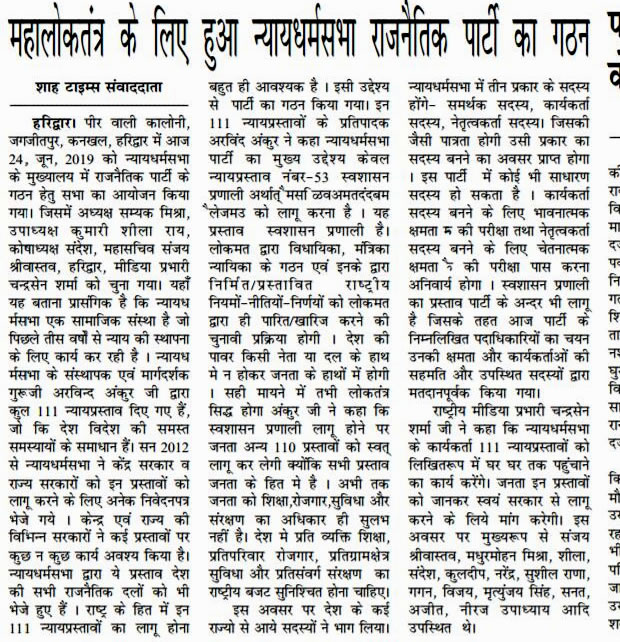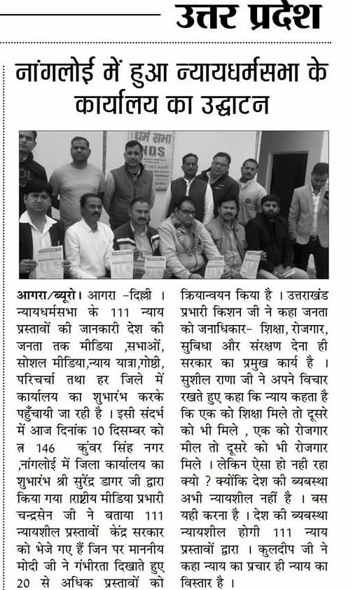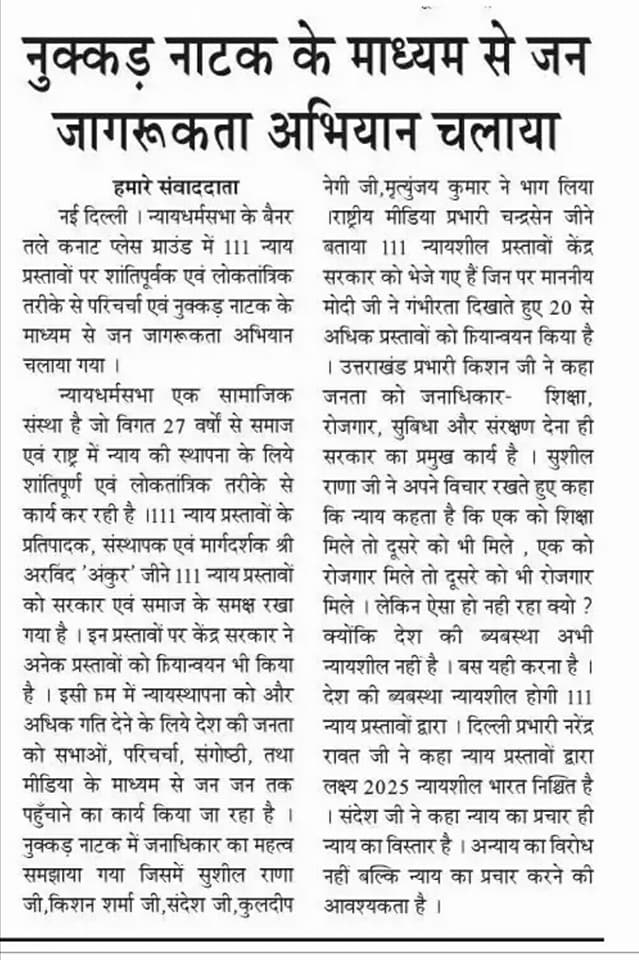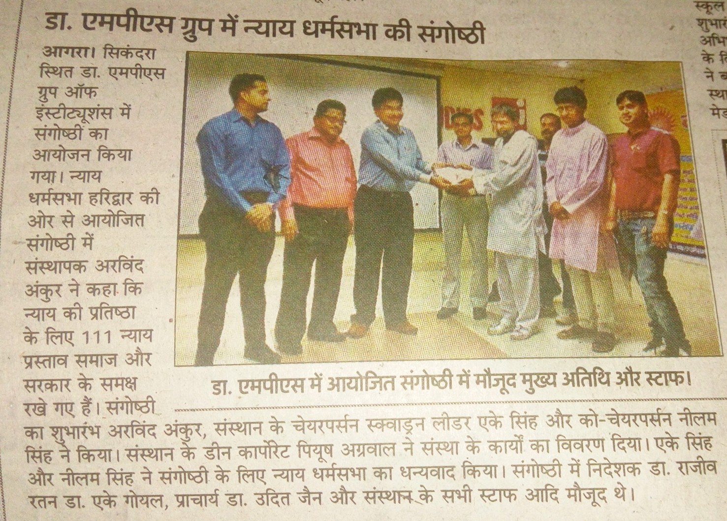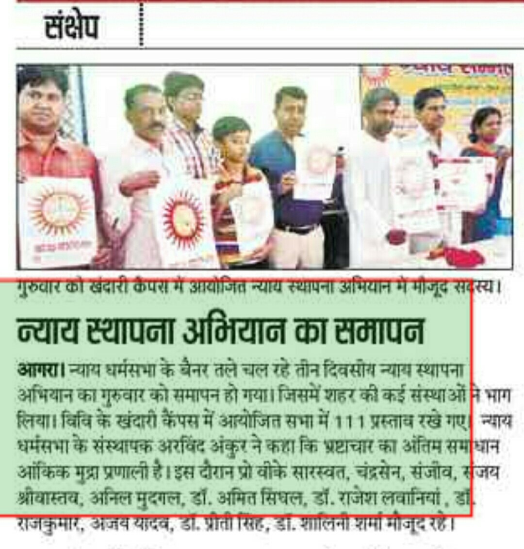 Conference Organized to announce the Formation of Social Parliament & Advent of Justice Journey Nyaya Dharm Sabha has organized a two days public meeting to announce the formation of Universal Social Parliament and to announce the beginning of Justice Journey to disseminate "Social Justice" in Society. Shri Ram Naresh Gupta, CEO of Raftar Times, Smt. Anny Kohli ji, famous Social Activist from Mumbai, Maharastra, Dr. Ashok Kabra, Social Activist, Maharastra have participated in the meeting. Also, All the members of Organization were present on the occasion.