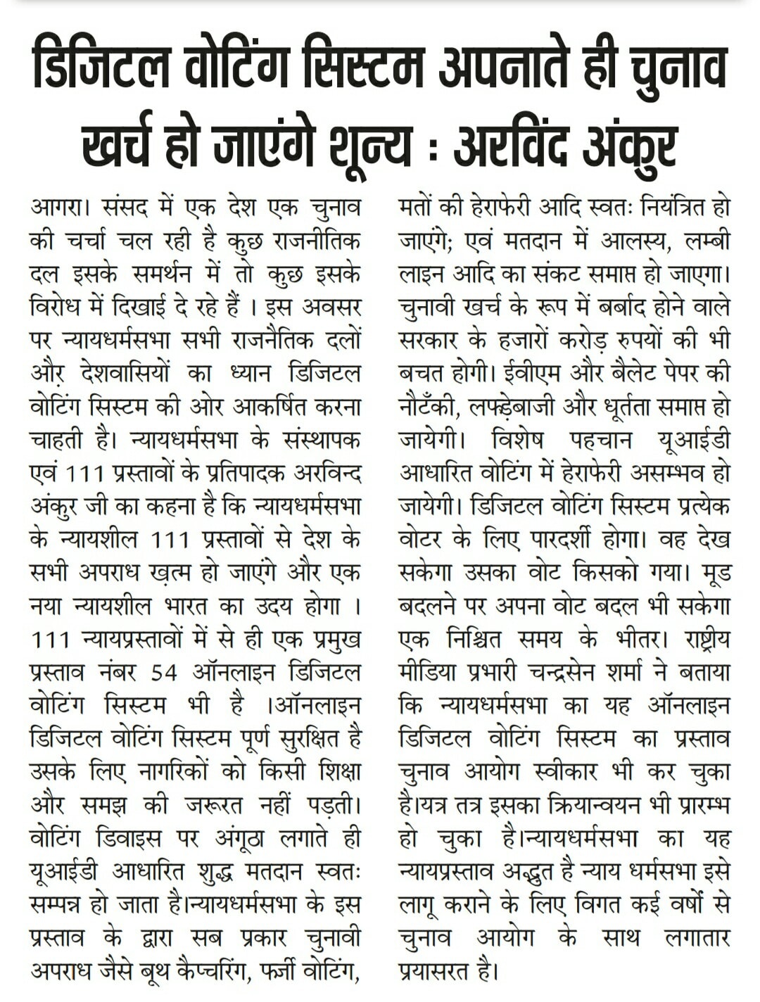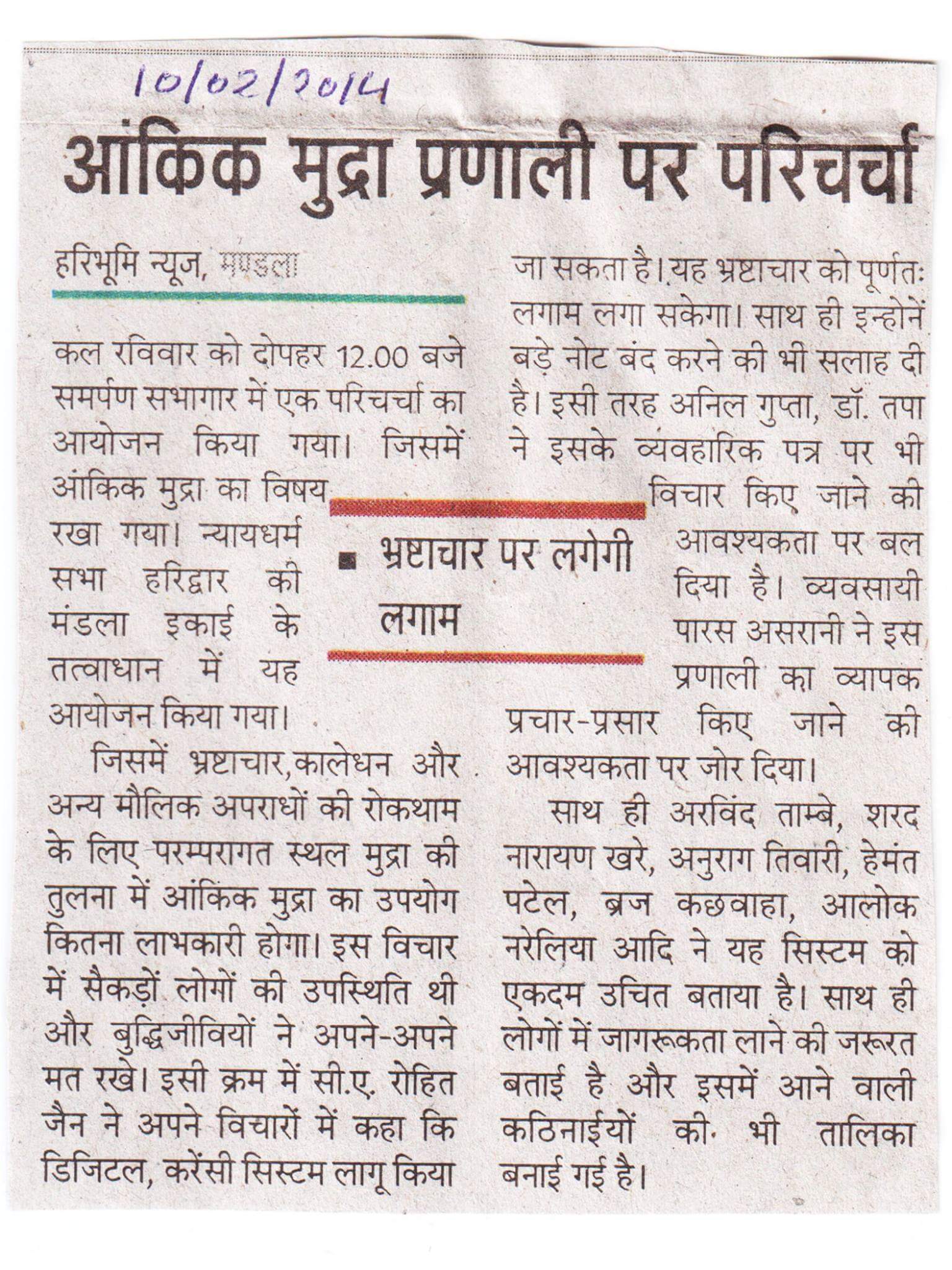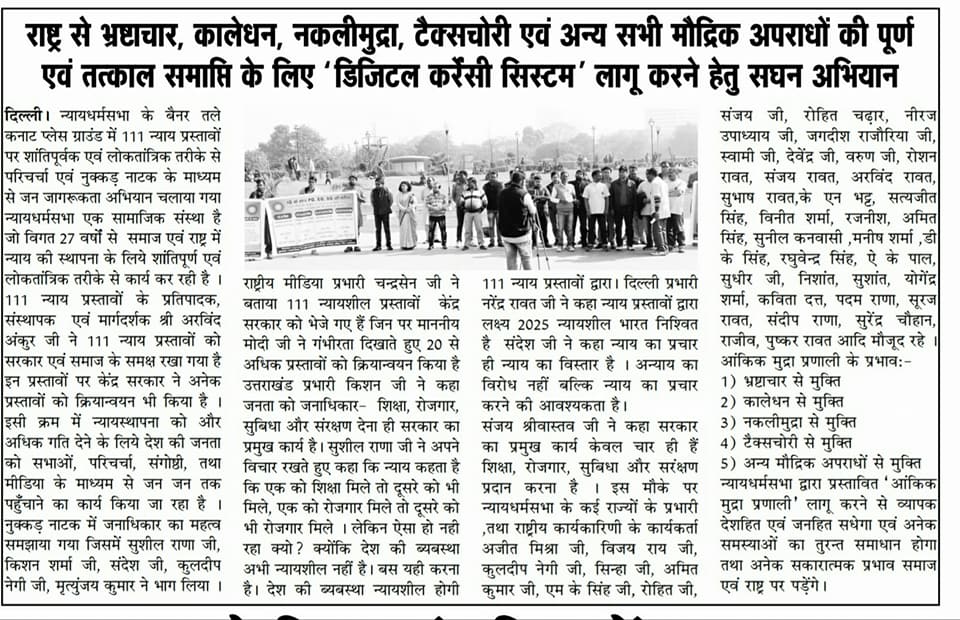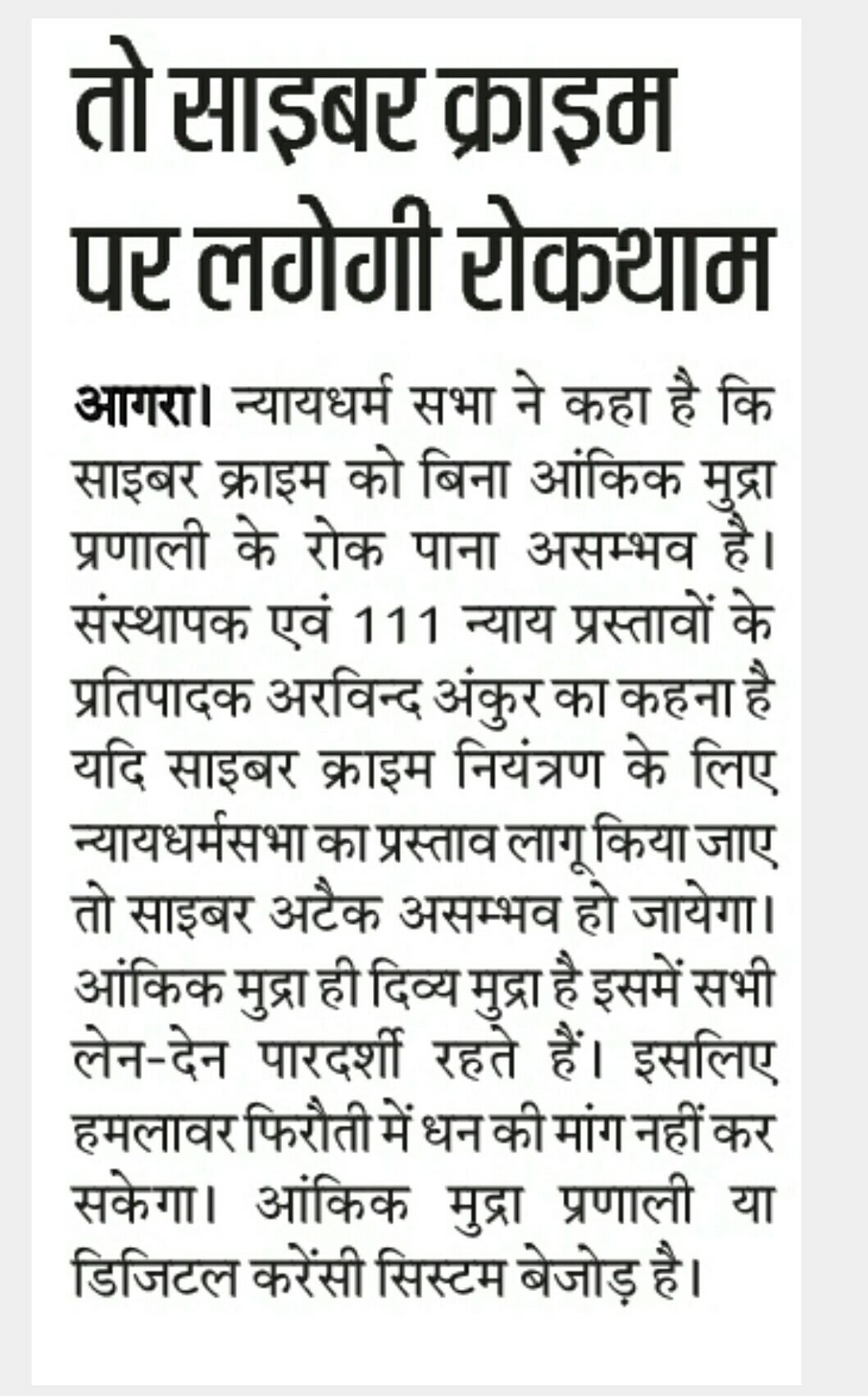 Today, Under the banner of Nyaya Dharm Sabha, a Seminar & Press Conference on Implementation of Digital Currency System in India & Abroad, has been conducted by Dharm Sansthapak Sangh. All the members of Organization were present on the occasion. Many Journlists from Print & Electronic Media attended the Program and they all have been provided Press Reports. Electronic Media persons asked many questions about Digital Currency System and its implementation. The Participants were very impressed to know the benefits of Digital Currency System launched by Shri Guru Ji. Hindustan, Amar Ujala, Dainik Jagran, Zee News, Total TV and from other many channels, the Press Reporters had paid their attentions on the matter. On the Occasion, Shri Guru Ji released a booklet on 'Digital Currency System', written by himself.