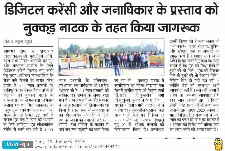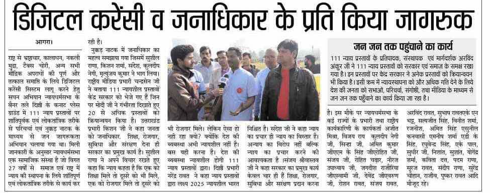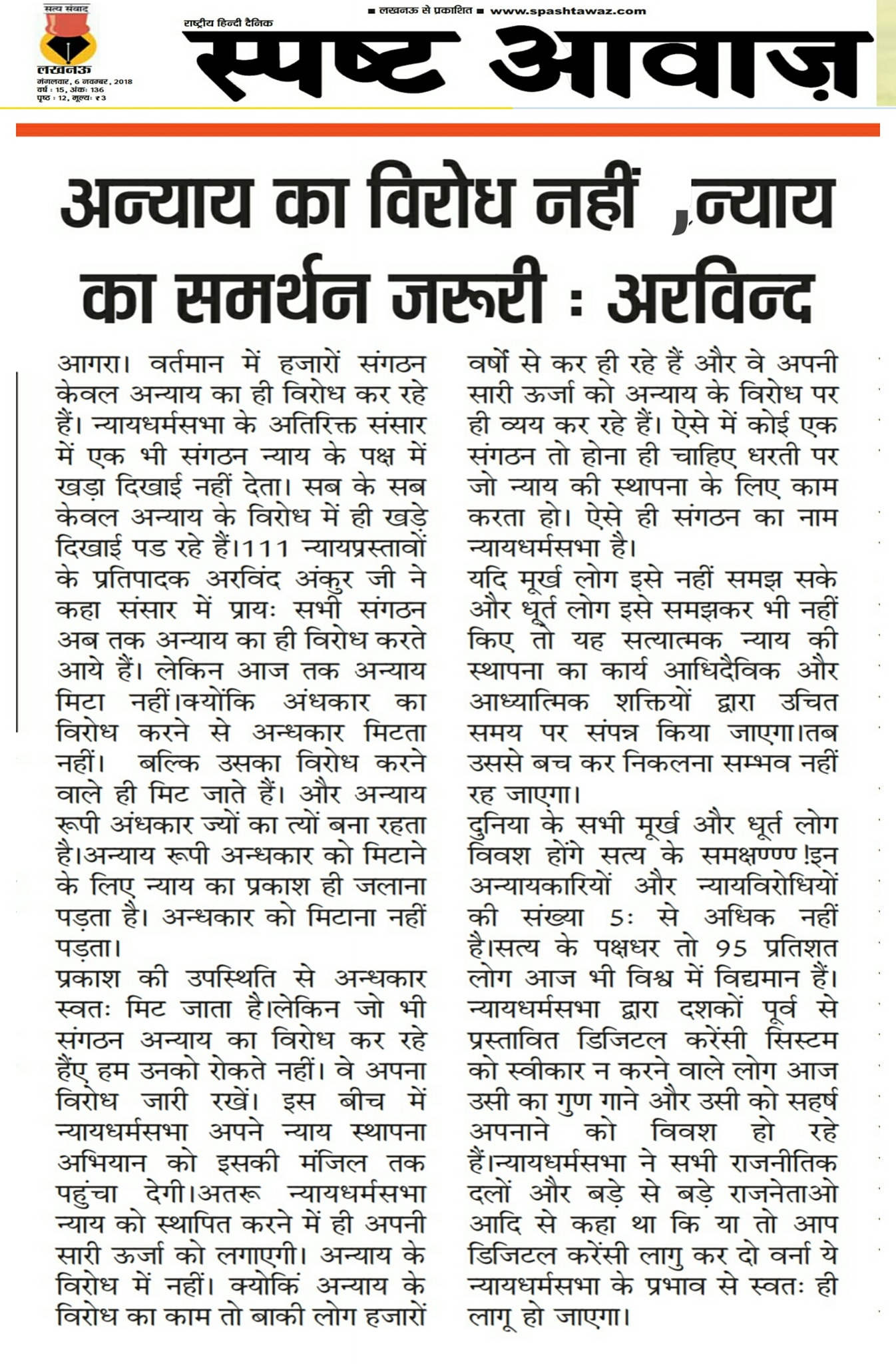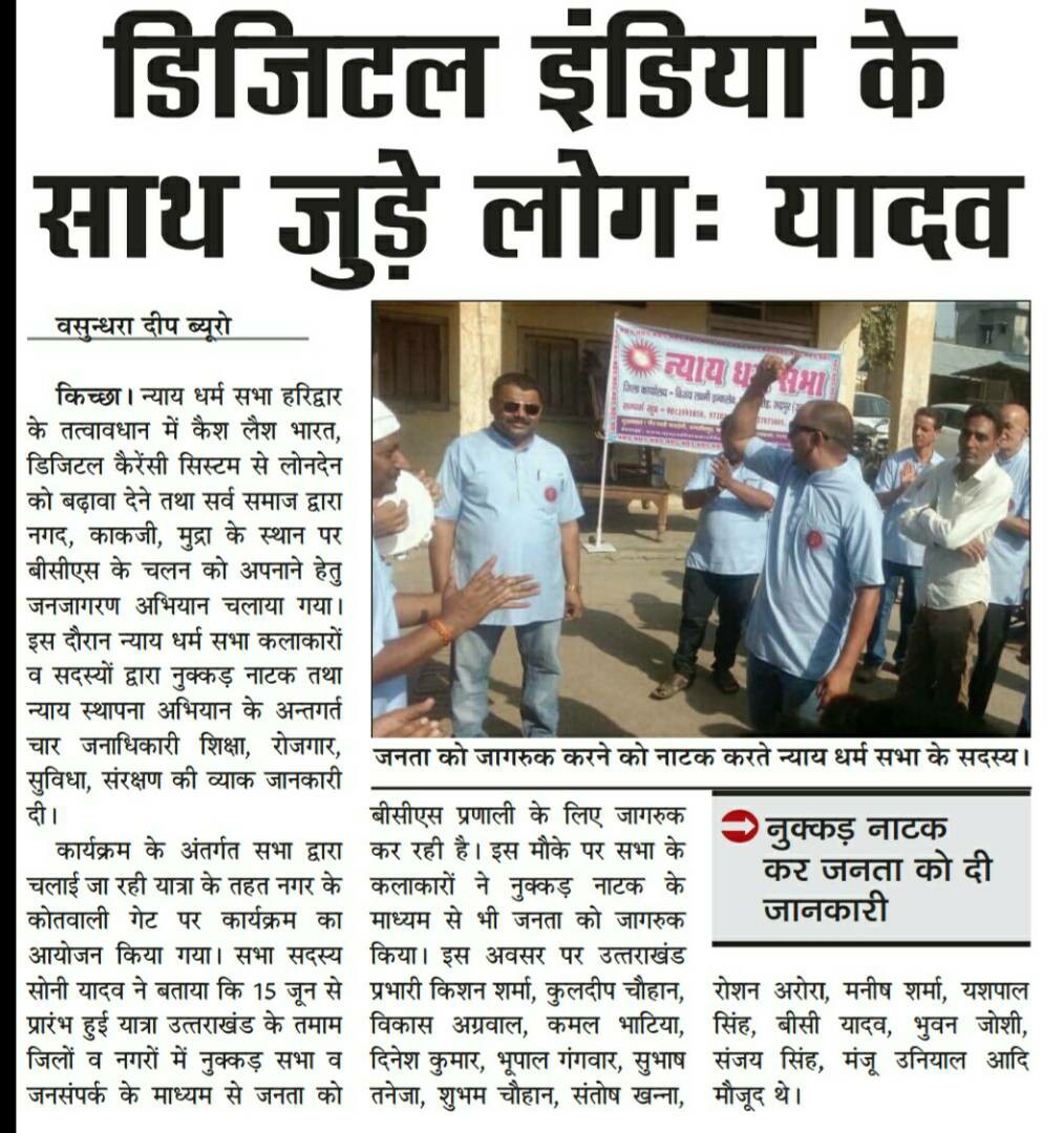 Today, Under the banner of Nyaya Dharm Sabha, a Seminar & Press Conference on Implementation of Digital Currency System in India & Abroad, has been conducted by Dharm Sansthapak Sangh. All the members of Organization were present on the occasion. Many Journlists from Print & Electronic Media attended the Program and they all have been provided Press Reports. Electronic Media persons asked many questions about Digital Currency System and its implementation. The Participants were very impressed to know the benefits of Digital Currency System launched by Shri Guru Ji. Hindustan, Amar Ujala, Dainik Jagran, Zee News, Total TV and from other many channels, the Press Reporters had paid their attentions on the matter. On the Occasion, Shri Guru Ji released a booklet on 'Digital Currency System', written by himself.