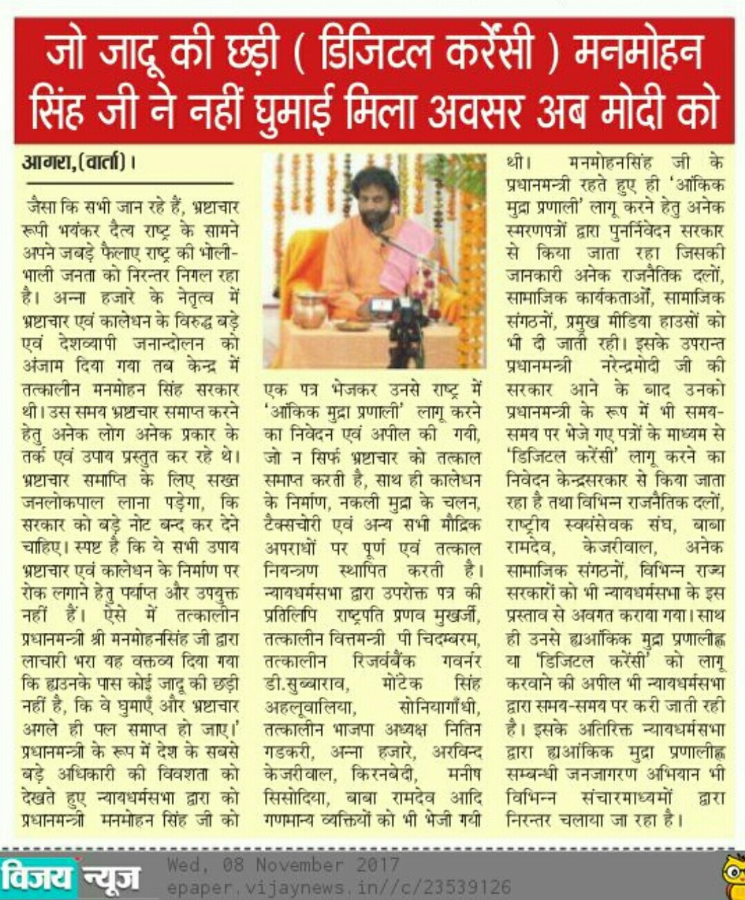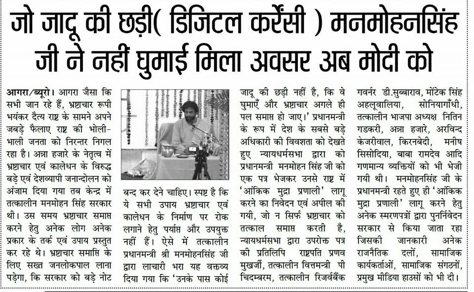 Today, Shri Guru ji has sent a letter to Assistant General Manager of RBI Shri Subhash chand about implementing Digital Currency System in the Nation in order to remove Corruption, Black Money, Fake Currency, Tax Evasion and Other Monetary Crimes from the Nation.