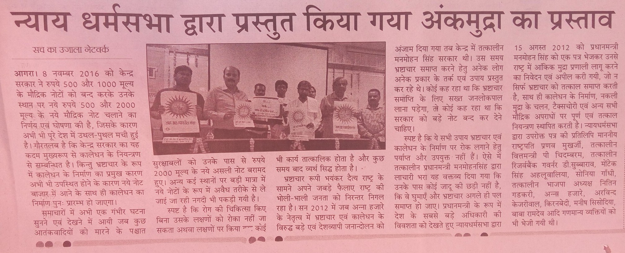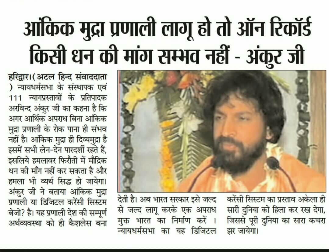 Today, on May 23, 2014, a 3 Days Seminar on "Justice Implementation" operated by Nyaya Dharm Sabha has been started with lighting an lamp by Shri Guru ji (Shri Arvind Ankur ji) & Guru Maa (Smt. Gayatri Ji). Being started the seminar, Shri Guru ji has published the 111 proposal made by Nyaya Dharm Sabha to resolve the Economical, National and Social problems from India & World. Shri Guru ji has declared Digital Currency System as a Magic Stick to remove Corruption, Black Money, Fake Currency, Tax Evasion and other Monetary Crimes from Society & Nation. By addressing the public, Shri Guru ji has also mentioned that Digital Currency can be operated with "No Expense" and the expenses that comes on printing & securing the paper currency can be saved and invested on other urgent Public Interest. Also, by implementing Digital Currency, each monetary transaction will be transparent as there will be no chance of conducting unrecorded monetary transaction becuase each transaction will be conducted via accounts of both parties.
