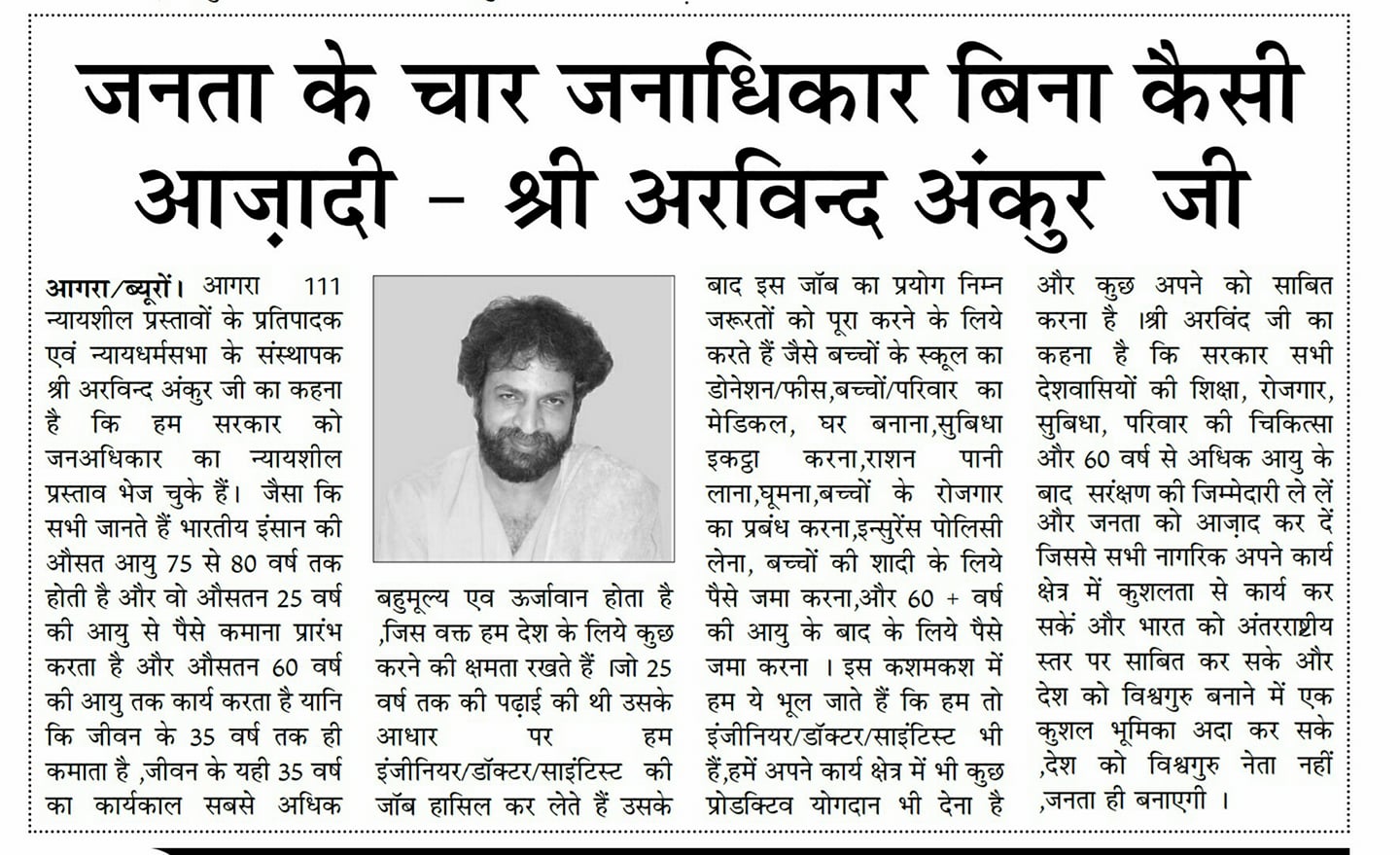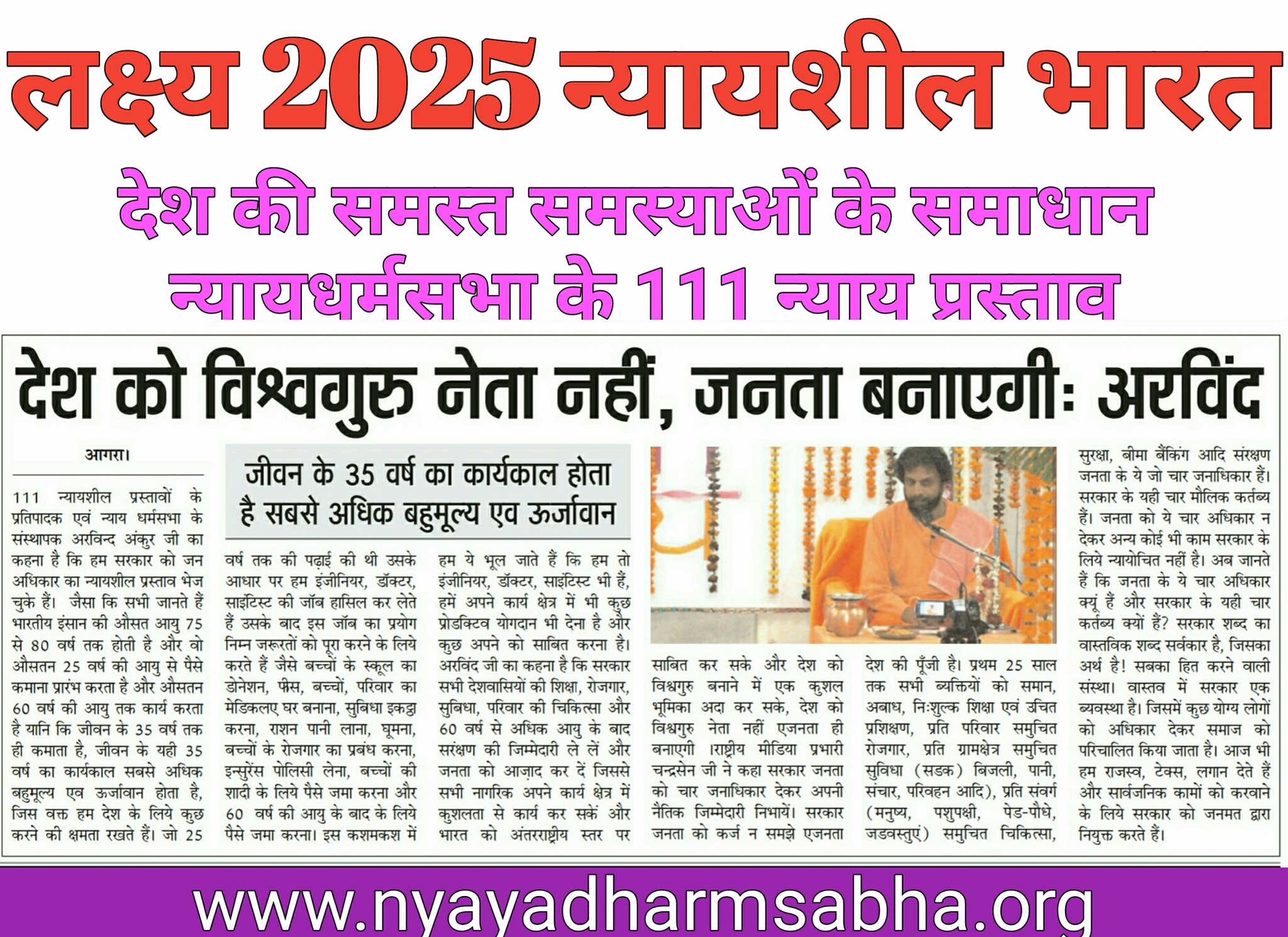 Today, A general meeting has been organized by Nyaya Dharm Sabha to launch the NDS Election Manifestio. Shri Ram Naresh Gupta, CEO of Raftar Times, Shri Shyam Gupta, previous memeber of Aam Adami Party and founder of Garib Adami Party, Dr. Ashok Kabra & Dr. Subhash Vyavhar, Social Activist, Maharastra have participated in the meeting. Also, All the members of Organization were present on the occasion. While addressing the meeting, Shri Guru Ji has released the booklet named Justified Political Manifesto. In this booklet, Shri Guru ji has given a complete National & Economical Justice required to be implemented in Nation & Society.