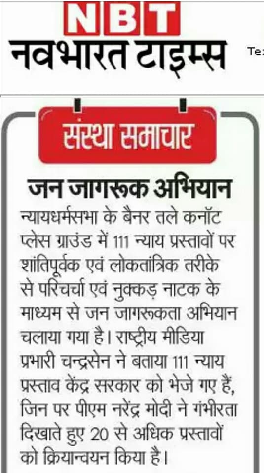Nyaya Dharm Sabha has annouced to start a "Justice Journey" in all over India. The prime purpose of this "Justice Journey" is to broadcast the True & Real of Social Justice and its principle & behavioural form. In this Justice Journey, the members of NDS will be peacefully rallied out in their belonging areas. In this rally, NDS members will march with Social Justice Banners, Posters & distribute the phemphalets to raise Public Awareness about Social Justice.