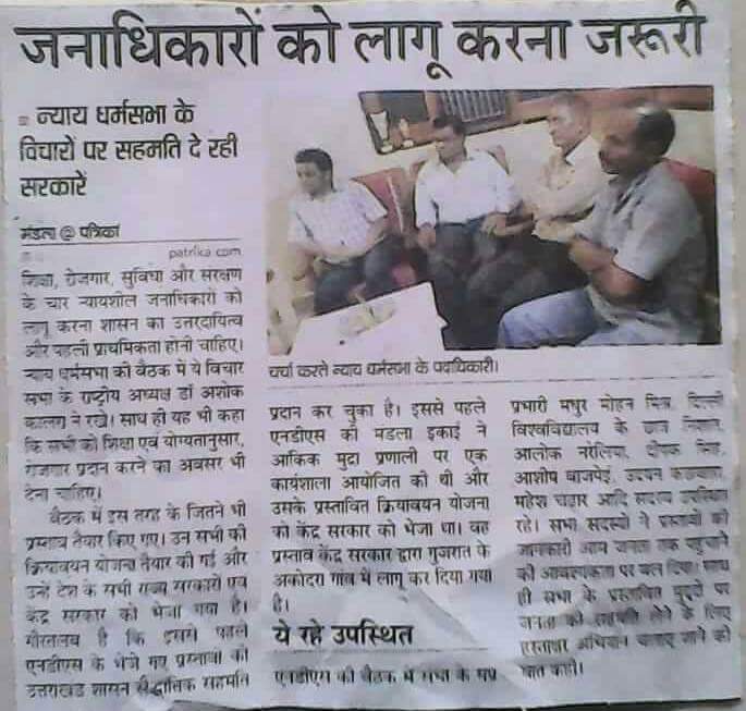 Today, on March 18, 2014, Nyaya Dharm Sabha has organized first "Justice Journey" in Jagjeetpur, Kankhal, Haridwar. The Rally was leaded by Dr. Ashok Kabra, Social Activist from Maharastra and along with local members of Nyaya Dharm Sabha, 50 people have participated in the Rally. In this Rally, NDS members marched with Social Justice Banners, Posters to raise Public Awareness about Social Justice.