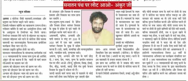 Today, a meeting of the followers of Shri Guru Ji (Shri Arvind 'Ankur' Ji) have been conducted in a garden out of the village Jagjeetpur. Addressing this meeting, Shri Guru Ji inspired all the Participants to accept the Justice as Religion of Society & Nation. He explained the meaning & importance of True & Real Justice. People present at that occasion in the meeting were very influenced to listen the True & Real form of Justice and all were expressed their consent to accept & follow the Religion of Justice. Many of them were decided to do all the things whatever required to establish the Justice on the Earth. Shri Guru Ji told them that the Justice is one of four dimension of Scientific & Philosophic Principle. These four dimensions are known respectively as Truth, Love, Justice & Goodness. Shri Guru Ji told that Truth is the Religion of Person, Love is the Religion of Family, Justice is the Religion of Society and Goodness is the Religion of Creation. From those people present in the meeting, Shri Guru Ji selected Five Persons to organize a Kaaryakaarini to execute the Works related to the campaign of establishment of Justice.