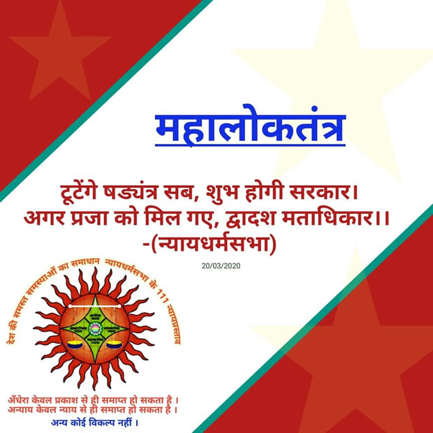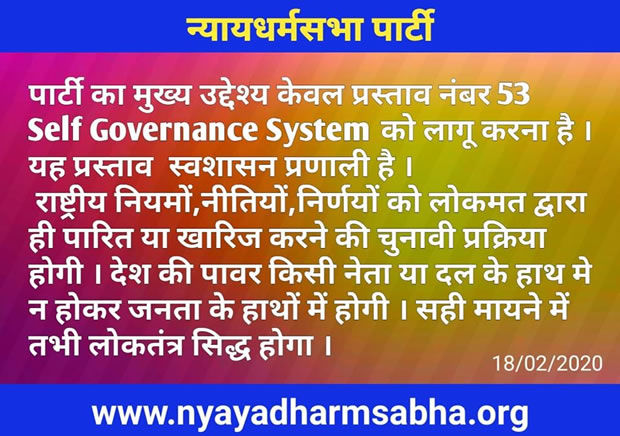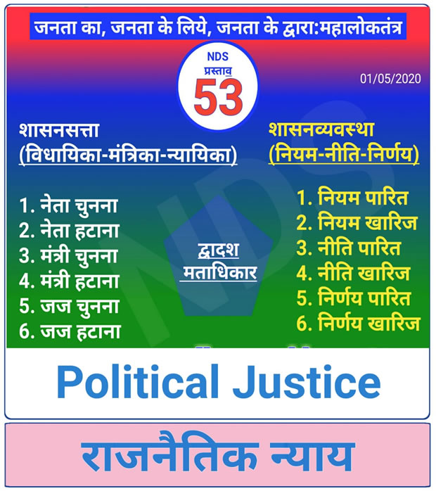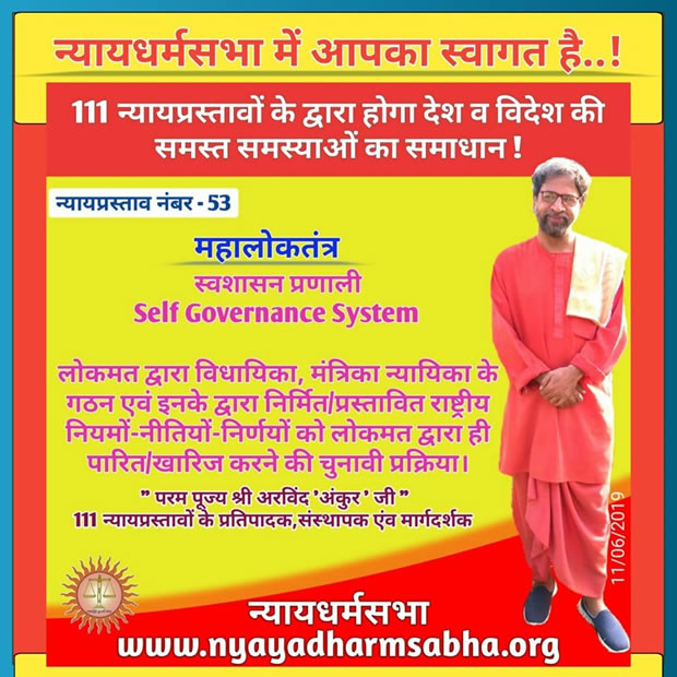 The Political Party 'Nyaya Dharm Sabha' (NDS) has proposed 111 Justice Proposals to implement the Justice in Society & Nation. The 53rd Justice proposal of NDS is Mahaloktrantra i.e. Justifiable Great Democratic Public Self Governance System. The proposal named Mahaloktantra strengthens the hands of Public of the Nation, where the Government body can not do anything without public consent. In Mahaloktantra, the Government Body and Governance System is operated by the Public Vote or by the Public Consent. That's why it is called the "Self Governance System" in which the Government is controlled by the Public itself. In Mahaloktantra, all three Sections and their operations are completely Democratic. This Mahaloktantra is the real and purest form of Democracy In Hindi, the Democracy is known as "Loktantra". The word "Loktantra" is a combination of two words- 'Lok+Tantra'. The meaning of "Lok" is Public, and the meaning of "Tantra" is Governance. The Public Governance is known as Loktantra i.e. Democracy.