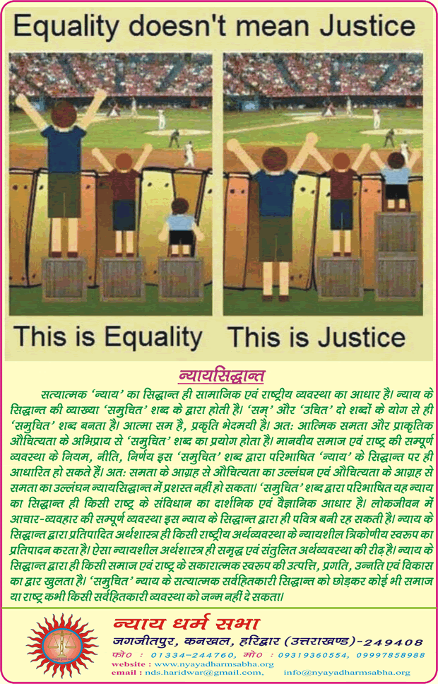 The Justice can be defined by the two Words - Equality & Appropriateness. Both these words may combinedly be known as Justice. Without Equality no Appropriateness can be proved Justifiable. In the same way, without Appropriateness no Equality can be proved Justifiable. A combination of these two words can establish the True & Real Justice. In Hindi Language, 'Equality' means 'Sam' and 'Appropriate' means 'Uchit'. Thus, both of these words are known by a single word 'Samuchit' in Hindi. The Soul & Nature combinedly work to create the World. In the same way, this World can only be managed through Equality & Appropriateness combinedly. These both words Equality & Appropriateness are explained as under :-